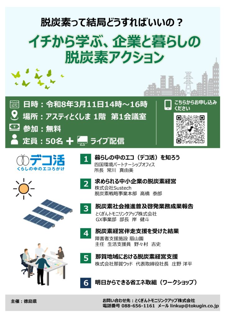 徳島県主催の脱炭素セミナー「イチから学ぶ、企業と暮らしの脱炭素アクション」において、那賀ウッドの庄野が「那賀地域における脱炭素経営支援」と題して事例発表をさせていただきます。