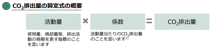 CO2排出量は、活動量(電気や燃料の使用量)に係数を乗じることで算定することができます。業務日報や請求伝票記載の電気・ガス等の使用量等から情報を収集し、算定しましょう。
