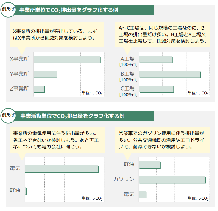 自社のCO2排出量をより詳しく知るために、事業所単位や事業活動単位で分析してみましょう。例えばグラフを作成することも有効です。グラフ化し横並びで比較することで、算定時における単位ミス等の気づきにも繋がります。